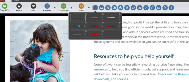 In the image below from my website, I’ve used Screenpresso to capture part of a page and am in the image edit mode where I can add arrows, text, boxes, squiggles, whatever. In the Image tab, there’s a Crop option as well as other editing tools. This is an easy-to-use, robust editing software and will be a huge benefit to all your content work.